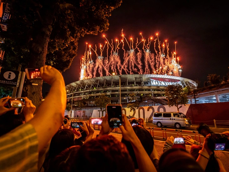 23 июля. Фейерверк в честь церемонии открытия Олимпийских игр 2020 года в Токио на Олимпийском стадионе.