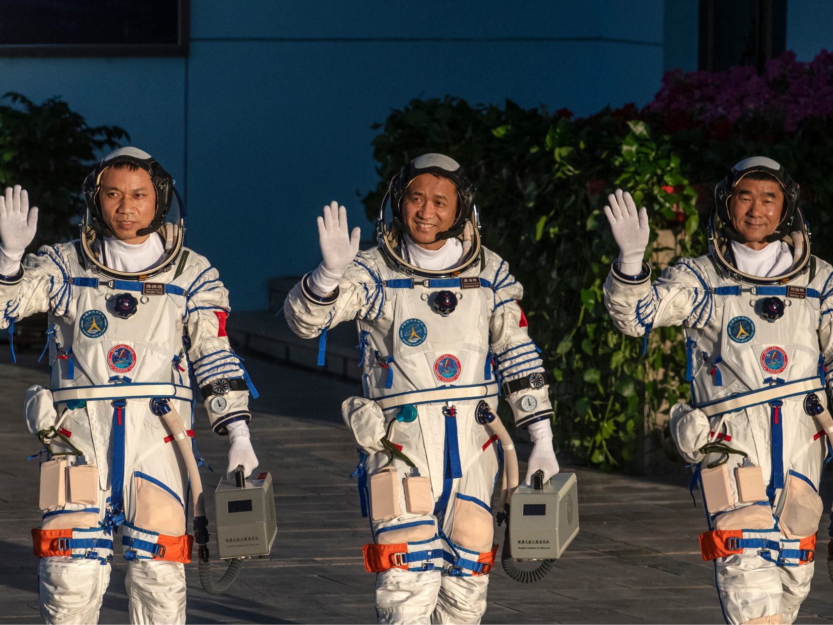 17 июня. Китайские астронавты перед запуском космического корабля Shenzhou-12 на китайскую космическую станцию. Миссия продлилась 92 дня — это новый рекорд продолжительности пребывания человека в космосе для Китая.