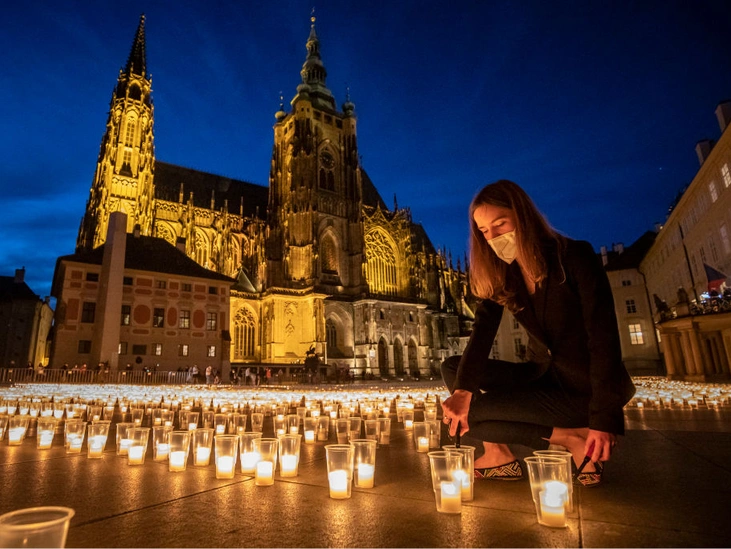 10 мая. Женщина зажигает свечи в память о 30 000 жертвах пандемии COVD-19 в Праге.