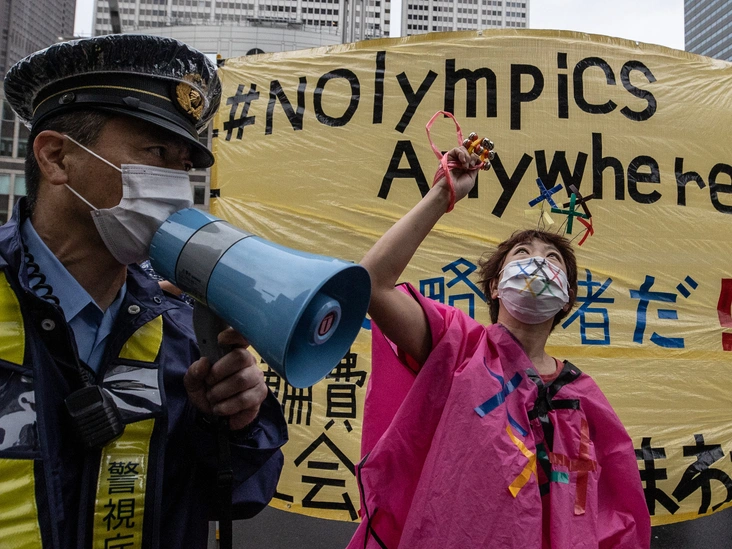 19 июня. Протестующие скандируют лозунги у здания правительства Токио. Поскольку официальные лица МОК начинают прибывать в Японию для финального этапа подготовки, а до церемонии открытия Олимпийских игр в Токио остается менее 40 дней, участники митинга призывают к отмене Игр из-за угрозы COVID-19.