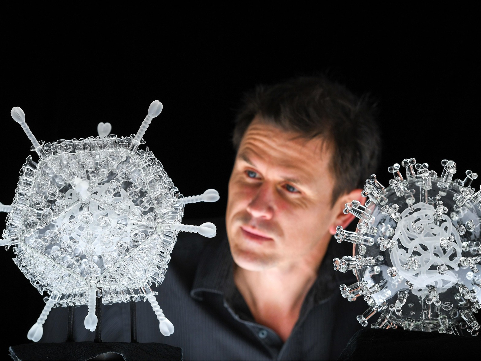 4 февраля. Британский художник Люк Джеррам презентует свою новую работу — стеклянную наночастицу вакцины от коронавируса Oxford-AstraZeneca (слева). Рядом с ней модель самого вируса. Презентация проходит в честь десятимиллионной вакцинации, проведенной в Великобритании.