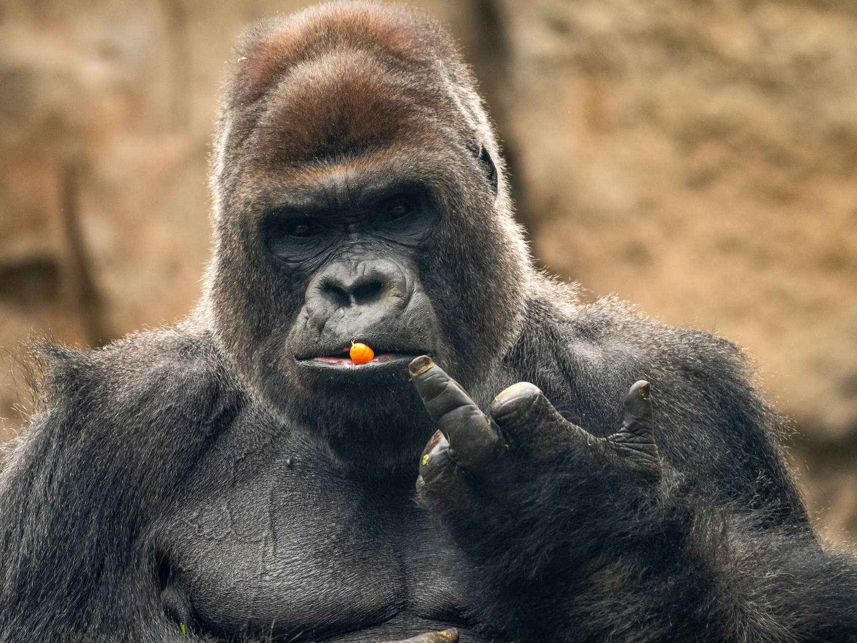 22 сентября. Горилла с морковкой во рту делает забавный жест в вольере Мадридского зоопарка.