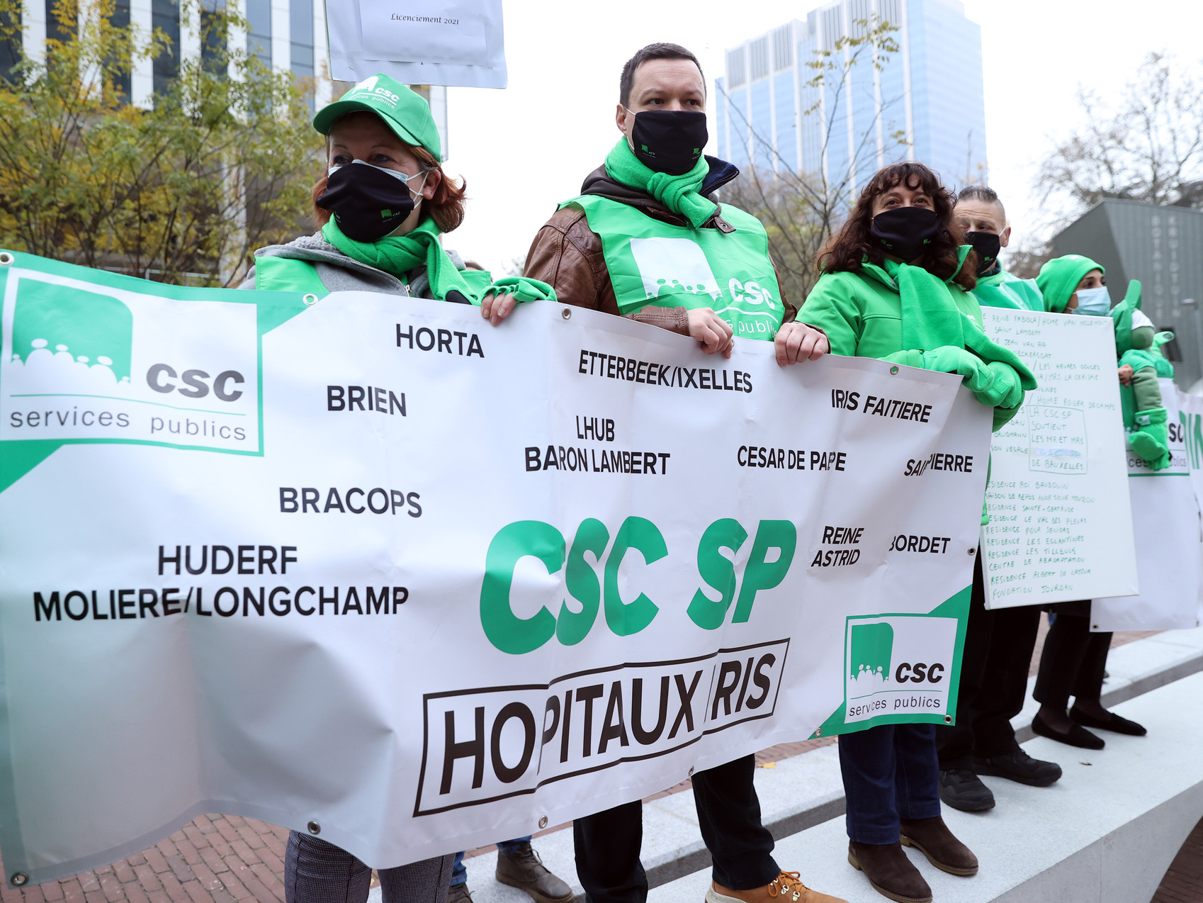 24 ноября. Группа медицинских работников держит плакат против проекта санкций, связанного с обязательной вакцинацией, перед офисом министра здравоохранения Брюсселя. Они принимают участие в одной из самых многочисленных акций против антивирусных мер. Позже полиция оценила численность протестующих в Брюсселе в 35 тысяч человек. Аналогичные акции прошли и в других городах Европейского Союза: Гааге, Ротердаме, Загребе, Вене.