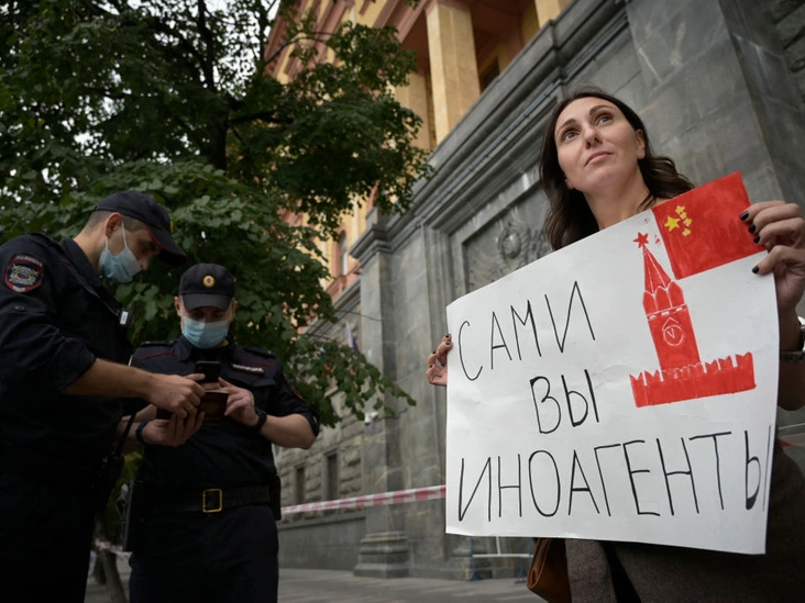 21 августа. Журналистка с плакатом выходит на одиночный пикет в знак солидарности с коллегами. Вчера независимый телеканал «Дождь» попал в растущий список «иностранных агентских» СМИ в России.