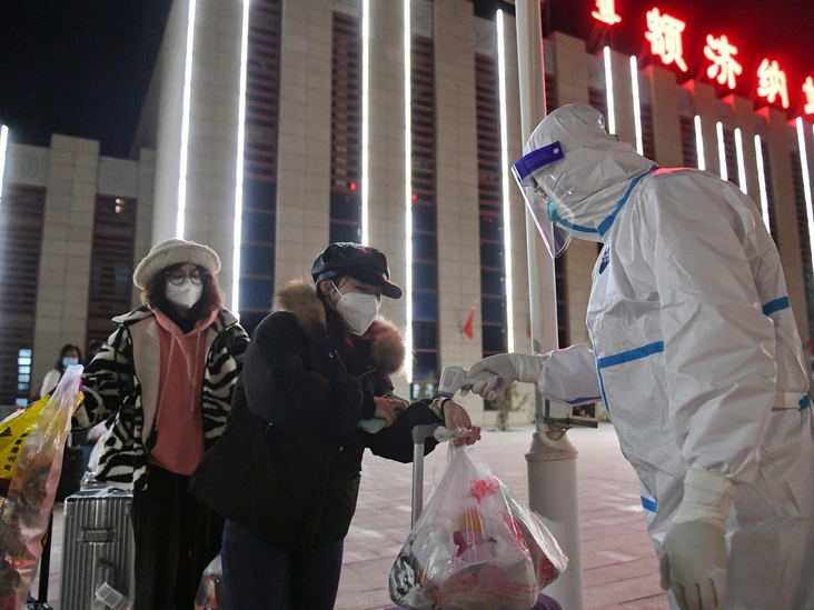 29 октября. Туристам проверяют температуру тела на железнодорожной станции в Китае. Через два дня количество умерших от COVID-19 в мире превысит 5 миллионов человек.