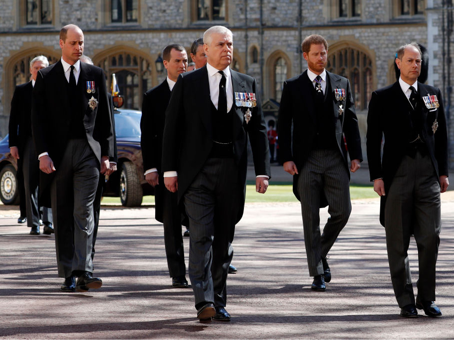 17 апреля. Мужская половина британской королевской семьи на похоронах принца Филиппа. Чтобы попрощаться с родным дедушкой, в Британию прилетел и принц Гарри, который годом ранее сложил с себя официальные обязанности и переехал в США вместе с супругой Меган Маркл.