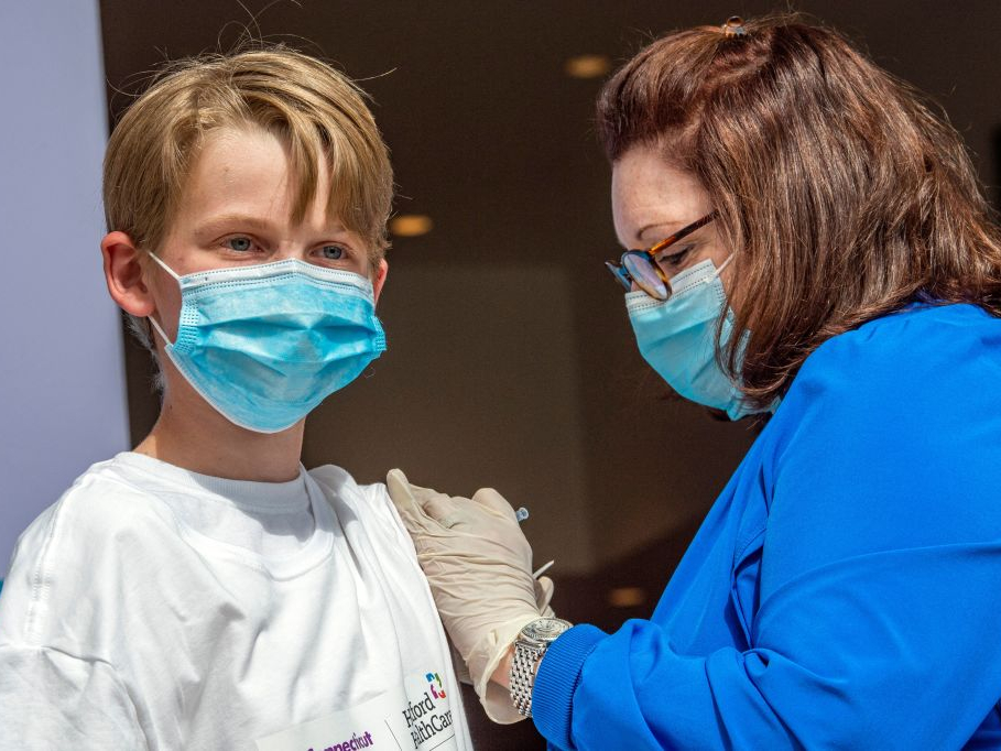 13 мая. Мальчику по имени Чарльз Муро (13 лет) делают прививку в центре массовой вакцинации Hartford Healthcares в Конференц-центре Коннектикута. В этом месяце в США вакцину Pfizer официально одобрили для детей возраста 12-15 лет.