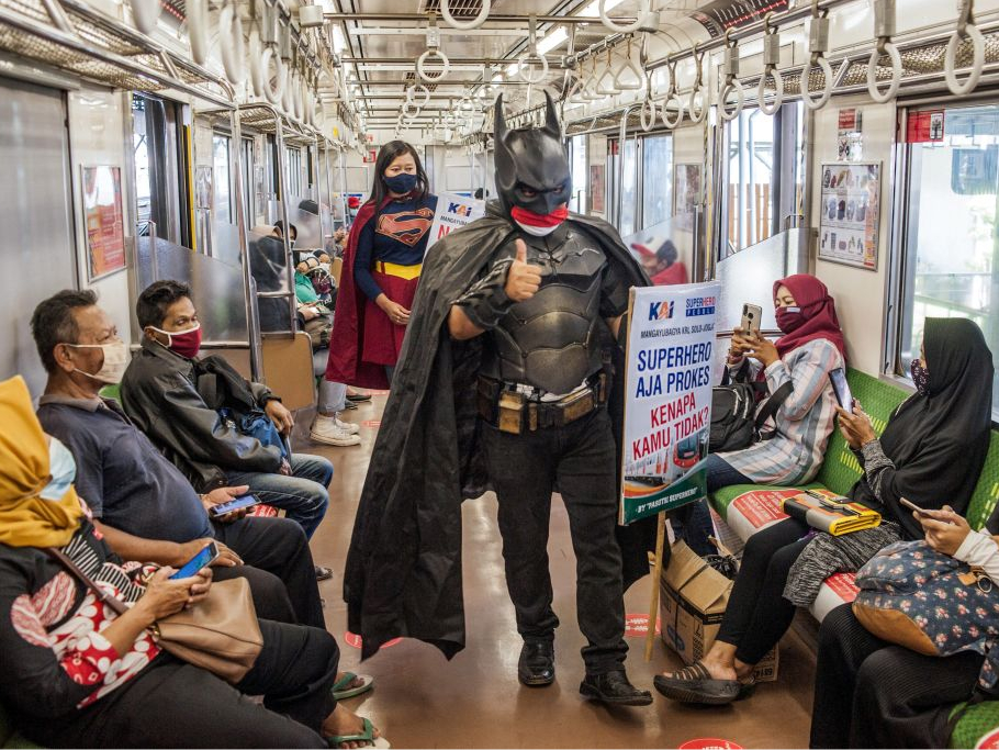 11 февраля. Индонезийская пара в костюмах супергероев идет по пригородному поезду с плакатами, объясняющими необходимость мер, направленных на предотвращение распространения COVID-19. Эта акция — их личная инициатива.