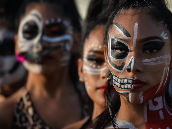 29 октября. Участницы танцевальной группы Ki'in Wac позируют для фото во время подготовки к выступлению на конкурсе, приуроченному к Дню мертвых (Día de Muertos) в Мексике.