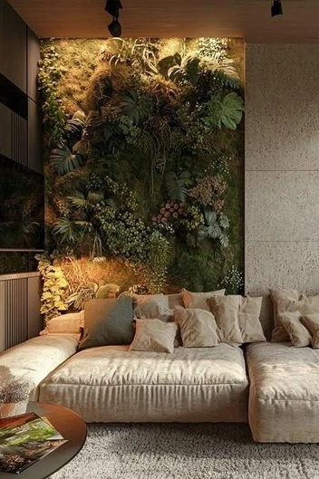 Живые стены и зелень: Вертикальные «сады» или покрытия из мха не только эстетичны, но и функциональны — они очищают воздух и добавляют текстуру пространству.