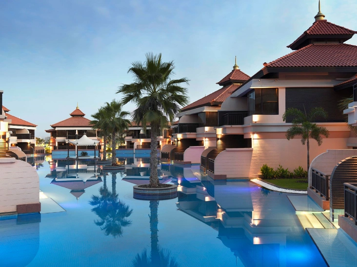 находится на искусственном архипелаге островов World Islands, воспроизводящих карту мира. Курорт расположен на «континенте Южной Америки» с богатейшей флорой: 4000 видов растений, в том числе тысяча кокосовых пальм и целая популяция павлинов. Это единственный отель в Дубае, где вам могут устроить трапезу на плавучем шатре с гамаками . Но это лишь одно из гастрономических предложений в рамках новой концепции Dining By Design. Можно, например, заказать «плавучий» завтрак и в вашем личном бассейне (курорт состоит от 70 утопающих в пышных садах вилл), ужин при свечах с блюдами любой кухни мира на берегу Персидского Залива или пикник в тени кокосовой пальмы. Еще одно незабываемое развлечение — кинотеатр под звездами в отдаленном уголке острова, скрытом от огней заведений и небоскребов. Гости возлежат на удобнейших креслах-мешках, им сервируют легкие закуски, попкорн и напитки. Действующее до конца октября спецпредложение Family Island Escape включает скидку на размещение, водные развлечения, (в том числе катание на надувном банане и ватрушках), доступ к детскому клубу, а также сертификат на 55 долларов в спа-центр отеля (при бронировании через сайт). Приезжающие со взрослыми дети проживают и питаются бесплатно. При раннем бронировании, а также проживании от трех ночей также предоставляются скидки. anantara.com