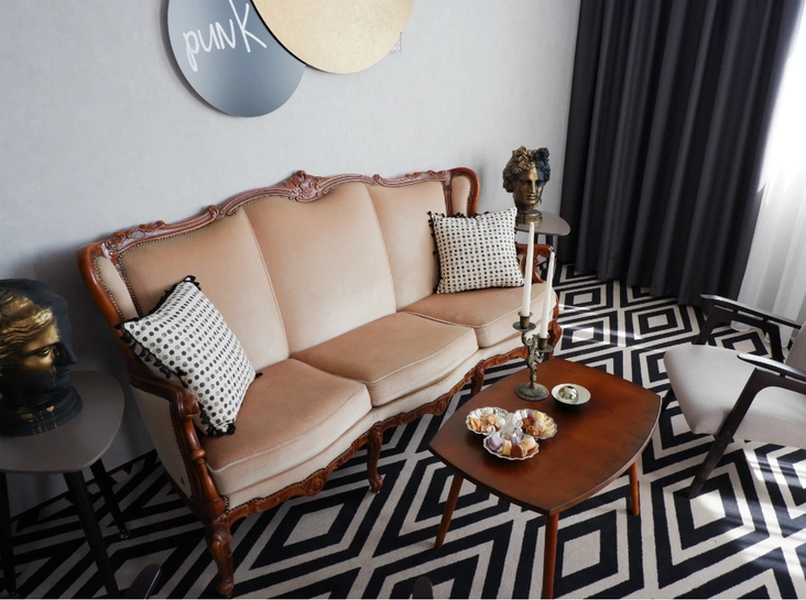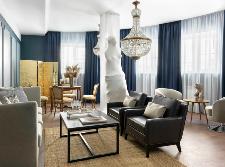 Интерьерная концепция бутик-отеля совмещает в себе винтажные элементы и современный стиль. Так, на фоне кирпичной стены царских времен и старинной двери, найденной в одном из заброшенных усадеб города, расположилась современная стойка-ресепшн из цельного массива секвойи, а винтажная люстра ручной работы гармонично дополняет элегантность стиля модерн.