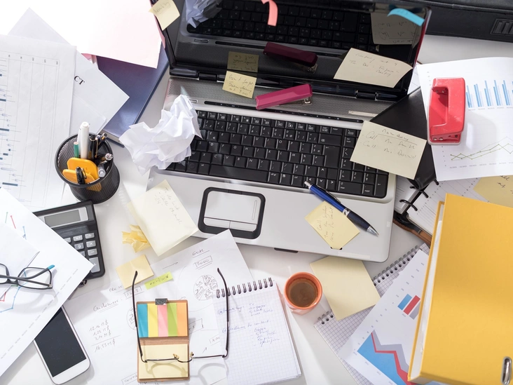 Если вы работаете (или учитесь) из дома — оцените состояние своего рабочего стола. Бывает, что там свалены кипы документов, хаотично разбросаны ручки, стикеры и пр. Это, впрочем, касается не только рабочего стола, но и прикроватных тумбочек, стульев с небрежно брошенной одеждой, кухонных столешниц.