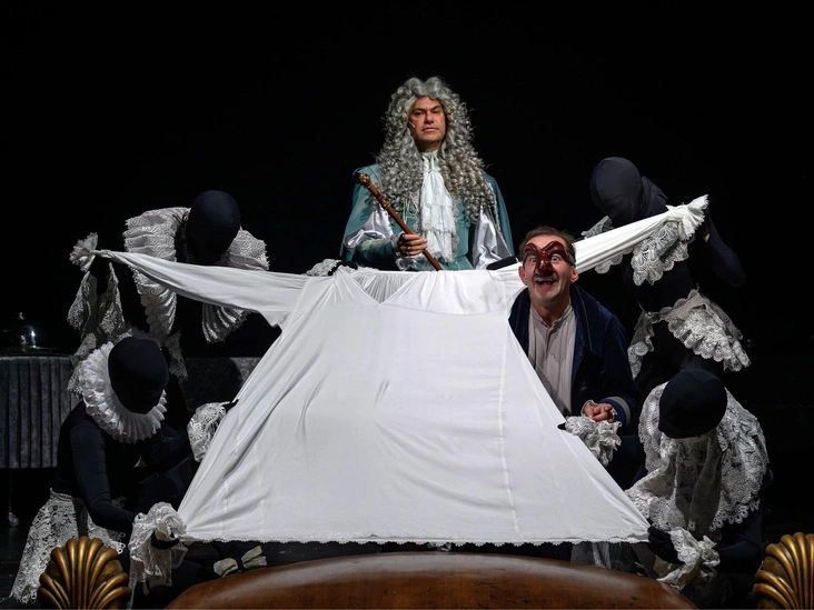 Времена меняются, но нравы остаются. Придворные заговоры и актерское братство, проблемы взаимоотношений дворцов и власти, свобода и рабство, любовь и предательство, правда и лицемерие, — все это переплетается на сцене, чтобы обнажить пороки и попытаться найти верный путь. Пьеса погружает зрителя сразу в три временные эпохи: золотой век Людовика XIV, советские 30-е и настоящее.