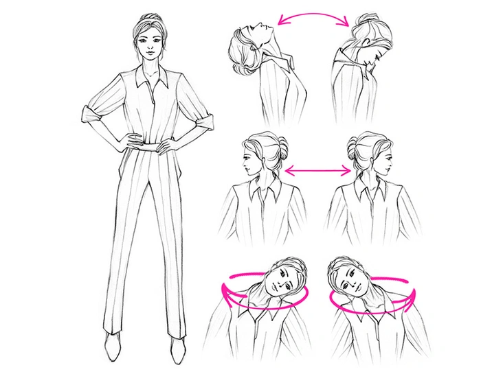 Самое незаметное упражнение ─ разминаем мышцы шеи. Упражнения необходимо делать стоя, чтобы позвоночник был ровным. Прежде всего, поверните голову влево, а потом вправо. После такой небольшой разминки выполните круговые движения головой 7–10 раз. В самом начале старайтесь опустить голову вниз, а потом — откинуть назад. Упражнения выполняйте по часовой стрелке и против нее.