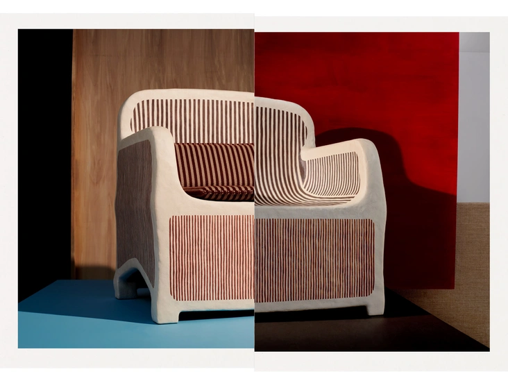 Дизайн этого кресла был разработан Studio Mumbai. Оно создано из дерева, вручную покрытого уникальным составом, содержащим микроволокна целлюлозы, произведенной в Апулии (Италия), на родине папье-маше XVI века. Это прочное, но изящное кресло представляет собой идеальный баланс между инновациями в материалах и ноу-хау предков.