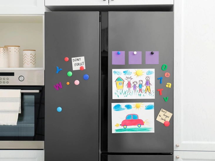 Безусловно, рисунки вашего ребенка красивые и замечательные, поэтому заслуживают быть увиденными по несколько раз на дню, но дверца холодильника — не самое идеальное место для художественной галереи. Бонусом к ним горсть магнитов и стикеров — и дверца выглядит аляпистой и загроможденной, уж точно не дополняя общий организованный вид кухни. Чтобы не засорять визуальное пространство, можно выделить отдельную стену в столовой и расположить на ней все желаемые декоративные предметы.