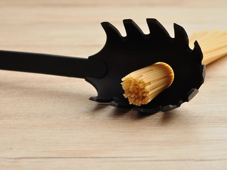 Высока вероятность, что от специальной ложки для макарон вы получите больше проблем, чем пользы, ведь такой инструмент не позволяет эффективно контролировать процесс подачи пасты. В итоге спагетти то и дело норовят выскользнуть из нее и разлететься вокруг.