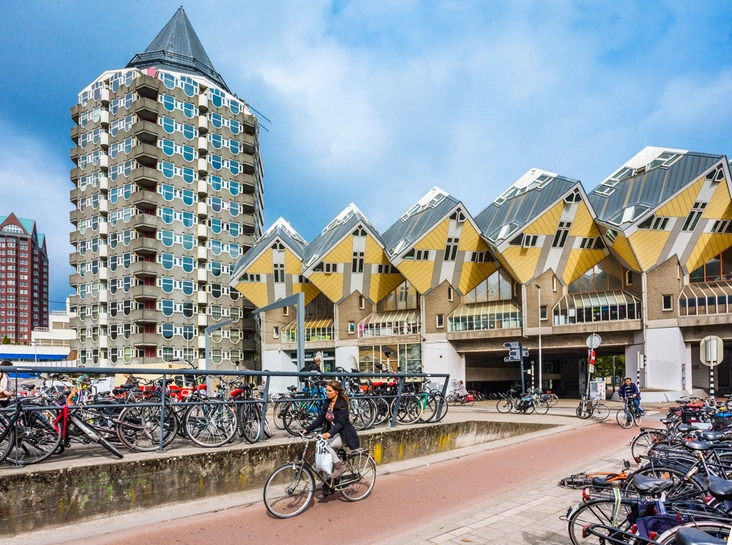Роттердам — второй по величине город Голландии после ее столицы. Разительно отличаясь от Амстердама, город-порт привлекает к себе туристов своей причудливой и современной архитектурой. Улицы города сами по себе являются выставкой современного искусства, поэтому для того, чтобы увидеть как можно больше, придется очень много гулять. Начать прогулку можно с исторической, пешеходной части города, отдаленно напоминающей традиционную Голландию. Далее следует обязательно посетить уникальное архитектурное сооружение — Кубические дома. Ряд домов, выполненных в форме куба, стоящих не на грани, а на вершине, образует замысловатую форму, напоминающую невозможный треугольник. Также в своем путеводителе необходимо отметить для посещения уникальный рынок Markthal (читайте также: «Роттердам: гид по «европейскому Манхэттену”»).