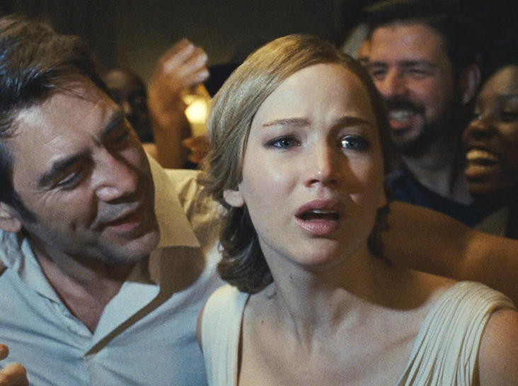 Начнём с того, что яркие впечатления от нового создания Арафонски стартуют уже с афиши – эдакая красочная картинка с чудовищными деталями, в стиле «Страшных сказок» Гарроне. Добавьте ещё к этому некрасивого красавца Хавьера Бардема и Дженнифер Лоуренс с её эльфийской внешностью – и, кажется, нас ждёт действительно что-то интересное. Безвестный поэт и его жена пускают к себе в дом странную семейку, а позже становятся свидетелями загадочного происшествия, постигшего постояльцев. Какое происшествие, спросите вы? Всё не так однозначно. Впрочем, у Арафонски однозначность вообще не в чести. На основе увиденного главный герой создаёт книгу, которая моментально становится бестселлером, а вот его супруга неожиданно становится объектом вожделения кучки безумных фанатиков, готовых увидеть в героине Лоуренс чуть ли не Богоматерь, восставшую, как птица Феникс, из пепла.