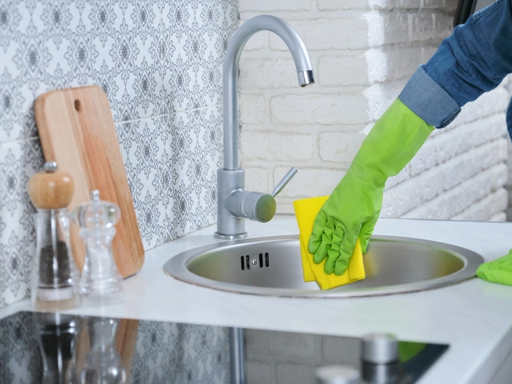 Если на металлической кухонной раковине и/или кране постоянно образуются белые разводы от жесткой воды — обильно смочите чистую сухую тряпку в обычном пищевом уксусе и сделайте из нее «компресс»: оберните тряпкой места разводов и оставьте на час. Затем уберите ткань и тщательно смойте уксус с помощью щетки или жесткой губки и теплой воды. После этого на поверхности раковины и крана не останется и следа от белых разводов.