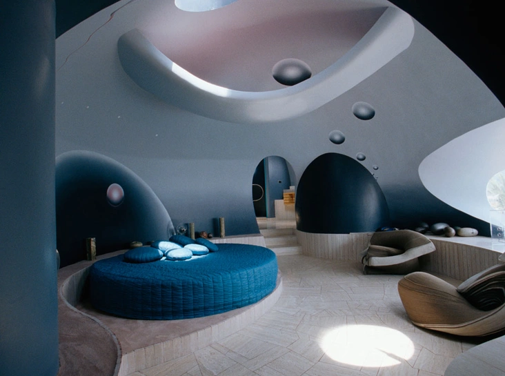 В помещениях создается впечатление оторванности от реальности. Каждое из них – это отдельная ячейка (автономный пузырь) с окном в виде огромного иллюминатора. Вместо стекол использовался прозрачный акрил. Мебель создавалась специально для этого дома. Аморфные очертания кресел и диванов гармонично вписываются в интерьер. Правда, есть в доме и недостатки – инсайдеры уверяют, что в сооружении протекает крыша, и оно не комфортно для проживания.