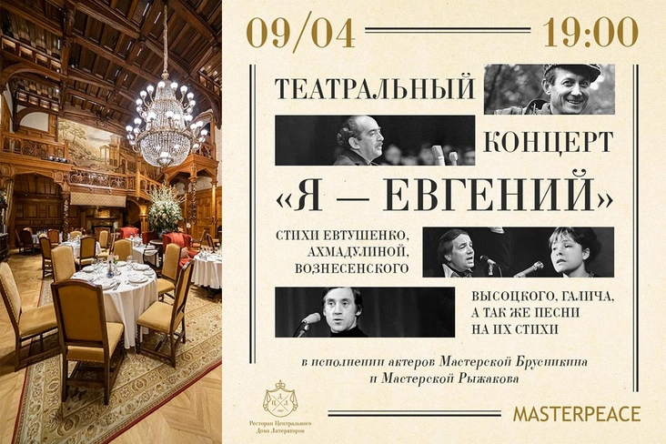 Ресторан Центрального дома литераторов приглашает любителей поэзии и изысканной кухни на премьеру театрального концерта «Я — Евгений». 9 апреля в 19:00 гостей знаменитого заведения в историческом здании с богатым культурным бэкграундом ждут стихи Евгения Евтушенко, Беллы Ахмадулиной, Андрея Вознесенского, Владимира Высоцкого, Александра Галича, а также песни на стихи авторов в исполнении актеров Мастерской Брусникина и Мастерской Рыжакова. Подавать будут блюда из специального меню в стиле 1960-х от Федора Верина. Предварительная бронь — на сайте restcdl.ru.