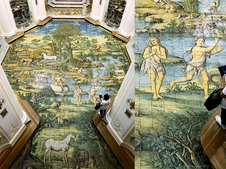 На прощание с Анакапри я оставил самое грандиозное. Иду смотреть восхитительную майолику в церкви Архангела Михаила, выполненную неаполитанецем Леонардо Чиаезе. Изображение размером во весь пол собора лучше смотреть, левитируя. Простым смертным легко впечатлиться грандиозным масштабом росписи с балкона второго этажа. Чтобы убедиться в реальности увиденного, можно спуститься непосредственно к плиточному полу. Наступать на него запрещено, да и страшно. Можно аккуратно обойти по «раме» – узкому деревянному настилу. Все многочисленные фигуры изображены в натуральную величину. Невольно становишься частью картины. Вам удастся по-новому понять до боли знакомый сюжет. «Изгнание из рая». Теперь я знаю, где и у кого хранятся ключи... от Капри.