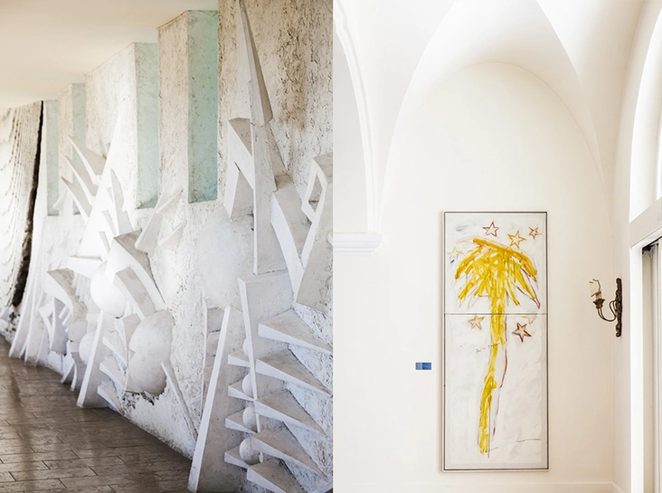 Но вернемся к Capri Palace. Марио прививал курорту стиль, а его сын Антонио сделал из отеля легенду. Антонио дружил с художниками. Они бывали его гостями. Он собирал свою коллекцию искусства. Она разместилась в отеле и буквально встречает вас. Сам вход в Capri Palace – огромный piece of art. Монументальный 33-метровый барельеф Арнальдо Помодоро. Экспрессивная композиция на тему морского дна. Через ниши-иллюминаторы видна толща воды бассейна. Можно наблюдать за ныряющими, представляя себя отдыхающим на дне Ихтиандром или русалкой. Мозаичное нутро бассейна – работа Веласко, другого известного художника. Вместо планов эвакуации на стенах отеля холсты Джорджо де Кирико и Кита Харринга. Искусство здесь везде. За стойкой бара работа Аллена Джонса в окружении бесконечного количества различных сортов джина. Джин и Джонс. И то и другое роскошно смешивается в пряные коктейли. Capri Palace местные называют «Белый музей» и водят сюда экскурсии.