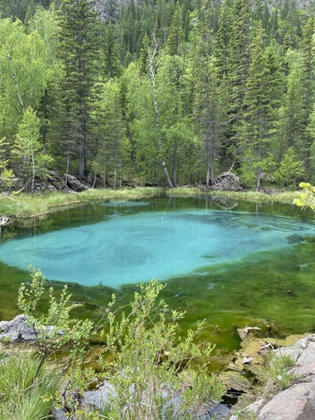 Еще одно поистине космическое место Алтая (хотя, будем честны, там сложно найти места не космические) — гейзерное озеро вблизи села Акташ Улаганского района на 796 километре Чуйского тракта. Невероятное по своей красоте, ярко-бирюзового цвета, оно словно всегда безмолвно глядит прямо в небо. Озеро не замерзает даже зимой, поэтому увидеть его во всем великолепии можно в любое время года. Удивительный цвет озера, как и необычные разводы на его зеркальной глади, объясняются, конечно же, не местным волшебством (хотя эта версия кажется вполне «рабочей»), а природными процессами — на дне водоема происходят выбросы смеси глины голубого цвета и песка, что и дает такой эффект.