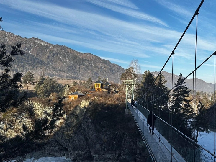Еще одна удивительная локация Алтая — женский монастырь на обрывистой скале, образовавшейся прямо посреди Катуни и также известной как остров Патмос. Попасть на остров можно только одним путем — по подвесному мосту. Возможно, на первый взгляд эта авантюра может показаться опасной, ведь вам предстоит пройти по узкому раскачивающемуся сооружению на огромной высоте, а под вами будут лишь бурлящие потоки дикой реки. Однако какие невероятные виды открываются с этого моста на ущелье и горы!