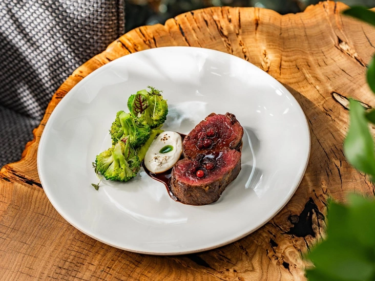 Шеф-повар Евгений Масловский экспериментирует с текстурами и вкусами, сочетая традиционные алтайские продукты с азиатскими и французскими нотками. Фирменные холодные закуски представлены такими локальными блюдами, как строганина или ростбиф из марала, паштет из дичи с лесным орехом и моченой брусникой, сугудай из муксуна с соусом из щучьей икры. Хит горячих блюд — стейк из марала с кремом из горошка, брокколи и соусом порто — сибирский деликатес, который можно попробовать только на Алтае.