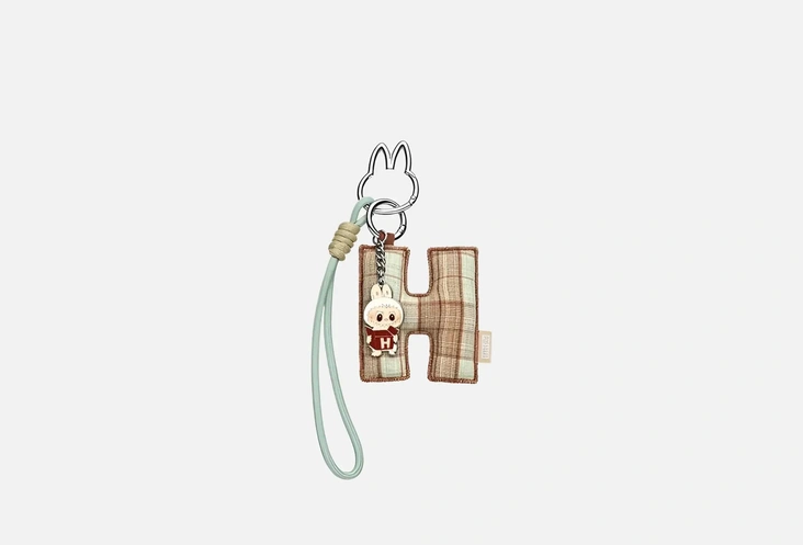Миниатюрная фигурка Labubu из коллекции Pin For Love от PopMart, посвященной языку любви через буквы и символы. Плюшевый брелок выполнен из хлопка и полиэстера, дополнен металлической подвеской в форме буквы «H» из цинкового сплава, украшенной бусинами и кольцом для крепления.