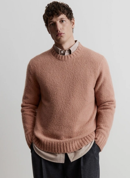 Уютный вариант в неординарном персиковом оттенке придется по душе мужчинам-Тельцам. Неоднородная фактурная нить придает джемперу эффект букле. Айтем легко стилизовать с любимыми рубашками.