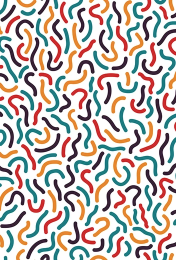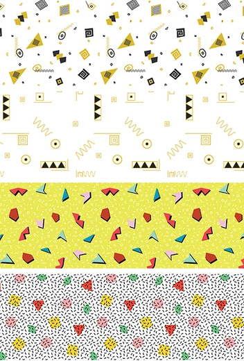 В графическом дизайне и на страницах популярных сайтов также можно встретить элементы стиля мемфис ─ например, его интересные паттерны, сочные цвета и геометрические узоры. Авторы таких изображений берут за основу орнаменты ─ линии, зигзаги и более плавные фигуры — и сочетают их с яркими контрастными оттенками.