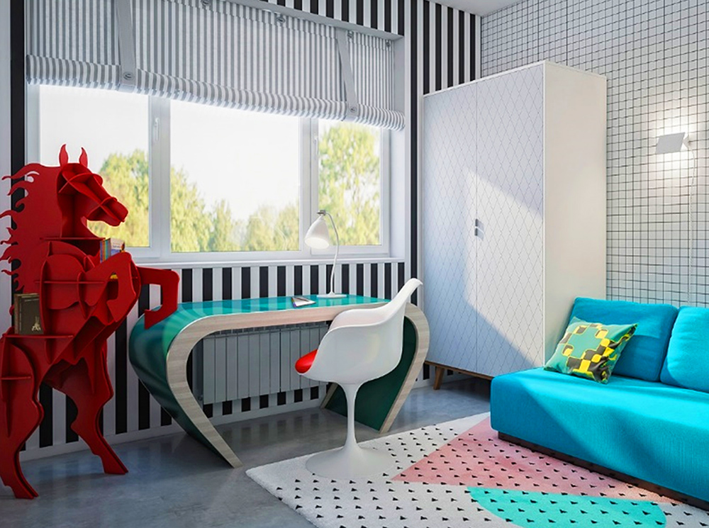 Для тех же, кому нравятся яркие интерьеры, но трудно воплотить в жизнь сразу все необычные элементы мемфиса, отличным решением станет декор: пледы, ковры, вазы или яркая посуда. Такие детали органично впишутся даже в спокойный интерьер и привнесут в него долю позитива и капелькую юмора.