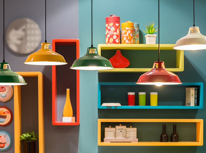 Все больше компаний делает предметы бытового дизайна в стиле мемфис. Каждый такой объект не только выполняет свою утилитарную функцию, но и выглядит как настоящий предмет искусства. Например, светильники, как будто рожденные в 80-е: плафоны разного цвета и форм подвешены на тросах и напоминают своим дизайном авангардные мобили.