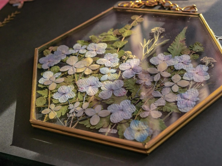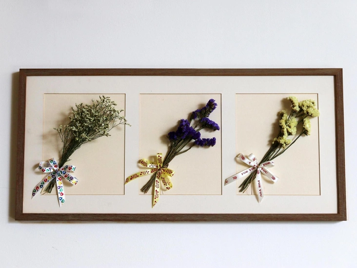 Зафиксируйте гербарий с двух сторон стеклом или сделайте подложку из картона или холста подходящего оттенка. Еще вариант — оформить сухими цветами любимую фотографию.