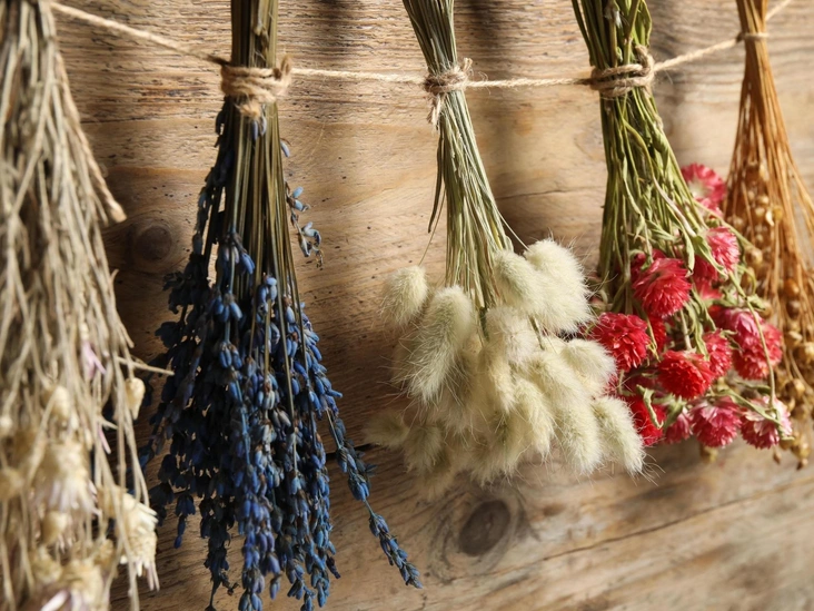 Розы, гвоздики, тюльпаны и другие цветы с плотными лепестками, а также лаванду и гипсофилу можно сушить в подвешенном состоянии, связав вместе несколько стеблей и подвесив их бутонами вниз на 2–3 недели. Важно, чтобы цветы находились в темном и хорошо проветриваемом помещении, иначе может появиться плесень. Предварительно нужно убрать шипы и поврежденные веточки и отрезать кончики, которые были в воде.