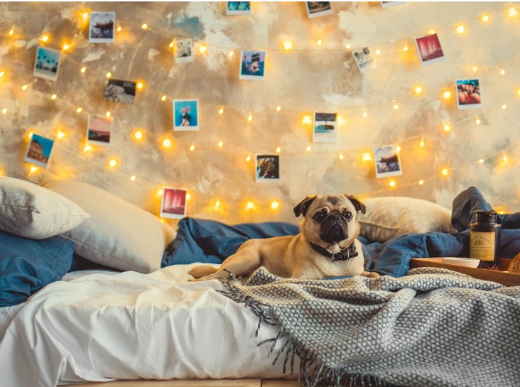 Украсить фотокарточками стену — самое простое и быстрое решение, которое может освежить интерьер. Для этого можно воспользоваться прочной веревкой, прищепками и, конечно же, гирляндой с огоньками для волшебного настроения.
