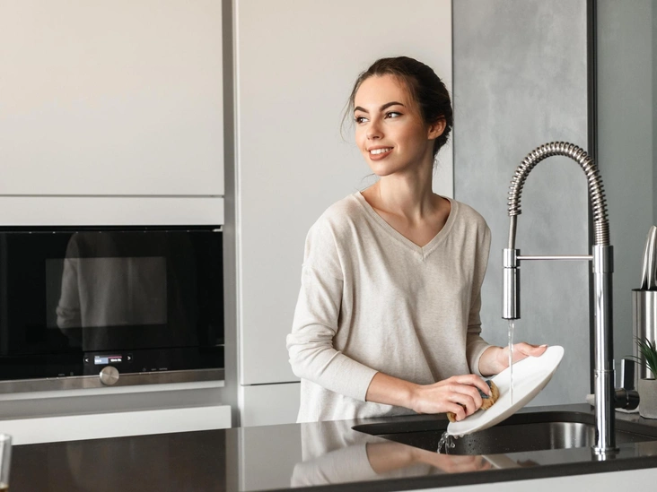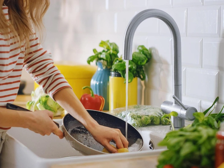 Еще из школьной программы у нас в голове должно было отложиться, что жир совершенно не растворяется в воде. Страшно то, что при контакте с водой жир застывает и превращается в плотный налет, который годами оседает на поверхности труб. Но как же быть? Все просто. Перед тем, как приступать к мытью посуды, промокните весь жир бумажным полотенцем, а затем начните удалять остатки загрязнений с помощью привычной бытовой химии (читайте также: 4 быстрых способа очистить сковороду от пригоревшего жира).
