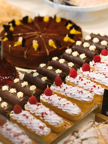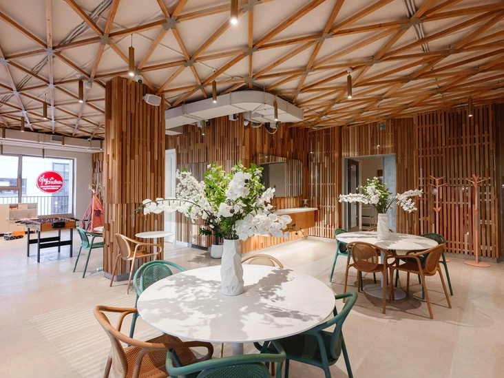 Район Хорошево-Мневники стал богаче на еще одно красивое заведение: осенью 2024-го года гостей с радостью приняла новая «Брусника» — кафе открыло свои двери в одном из самых активных жилых кластеров — элитном комплексе Wellton Gold. 20-я по счету локация поражает своим масштабом: сладкоежек ждет просторное двухэтажное пространство с собственным лифтом и красочным детским уголком. В оформлении, как и всегда, использовано много натурального дерева, которое создает уютную, по-настоящему домашнюю атмосферу. Центральную часть зала занимает белоснежная стеклянная витрина, поражающая многообразием аппетитных кондитерских изделий и кулинарии на любой вкус. Большие зеркала и отражающиеся в них изящные латунные светильники визуально расширяют пространство, придавая ему особой воздушный, игривый шарм.