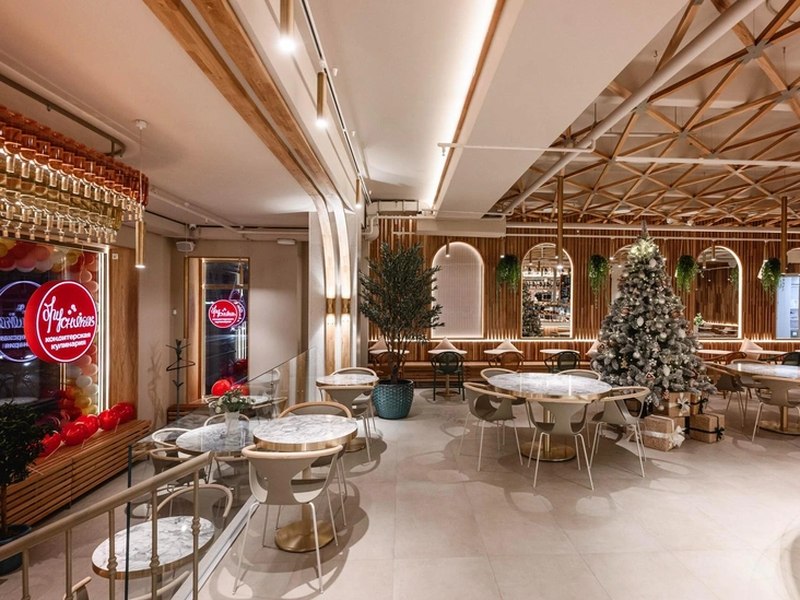«Новая „Брусника“ получилась масштабной и невероятно красивой, хотя перед началом строительных работ было сложно представить подобный результат. Само помещение оказалось проблемным для дизайнерских решений — расположенные на достаточно низком потолке ребра, характерные для архитектуры конструктивизма, совсем не ложились в дизайн-проект (в „Бруснике“ всегда используется прием навесного потолка из бука с ромбами). В итоге мы приняли решение закрыть проблемные ребра вплотную, чтобы не изменять фирменному стилю. Элегантность помещению придают изящные арки из дерева и арочные зеркала — идеальное место для селфи!», — рассказывают Юлия Артемьева и Павел Мокрушин, основатели бренда «Брусника».