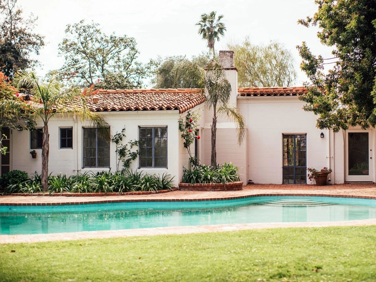 Эта вилла была построена в популярном на тот момент калифорнийско-испанском стиле: створчатые окна, потолки с открытыми балками и дерево, преобладающее в оформлении стен и потолков. Всего в доме было четыре спальни, три ванных комнаты, гостиная и кухня, а его участок, как будто, был специально создан для того, чтобы проводить на нем спокойные теплые вечера — бассейн, апельсиновая роща, цветники и гостевой домик.