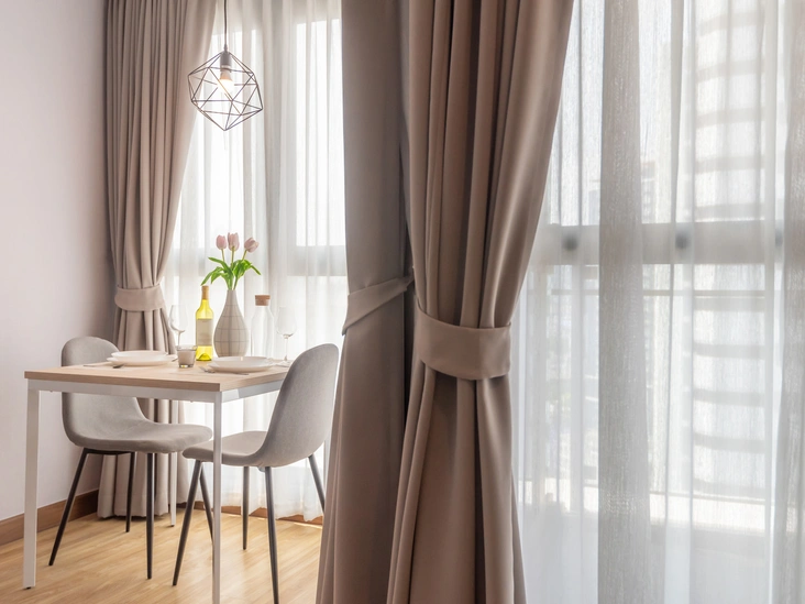 Выбирайте шторы из тканей светлых расцветок. Они не притягивают солнечные лучи и зрительно увеличивают пространство. При покупке занавесок отдавайте предпочтение рулонным или римским, так как обычные не очень удобны при частых открывании и закрывании окон.