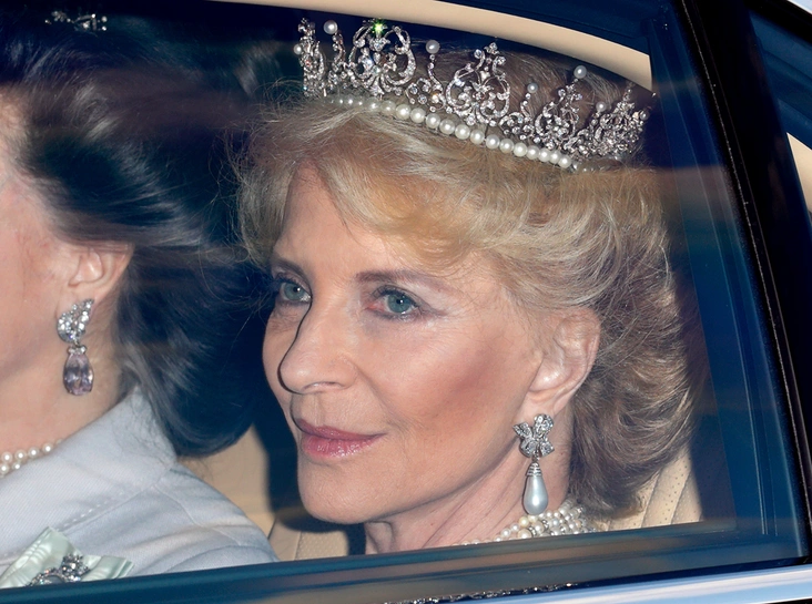 Хозяйка приема, Елизавета II, однако, не пожелала сливаться с залом и облачилась в белый и голубой: королева подобрала светлое шелковое платье, декорированное лазурной вышивкой, и дополнила образ знаменитой аквамариновой парюрой, преподнесенной ей народом Бразилии в 1953 году. Свое почтение Фелипе и Летиции Елизавета выразила, надев орден Золотого Руна – одну из самых древних династических регалий Испанского королевского дома.