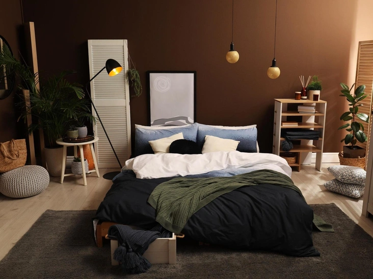 Есть такой стереотип, что темные цвета — неуютные, кричащие, нерасслабляющие, и их не стоит использовать в спальнях или других приватных помещениях. Но про это давно пора забыть. Глубокие темные оттенки, например, теплый бордовый, теплый глубокий травянистый также способствуют расслаблению человека и придают пространству уют и спокойствие. Расширяйте спектр используемых цветов в интерьере. Главное — верно подбирайте их теплоту.