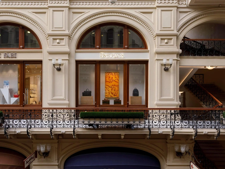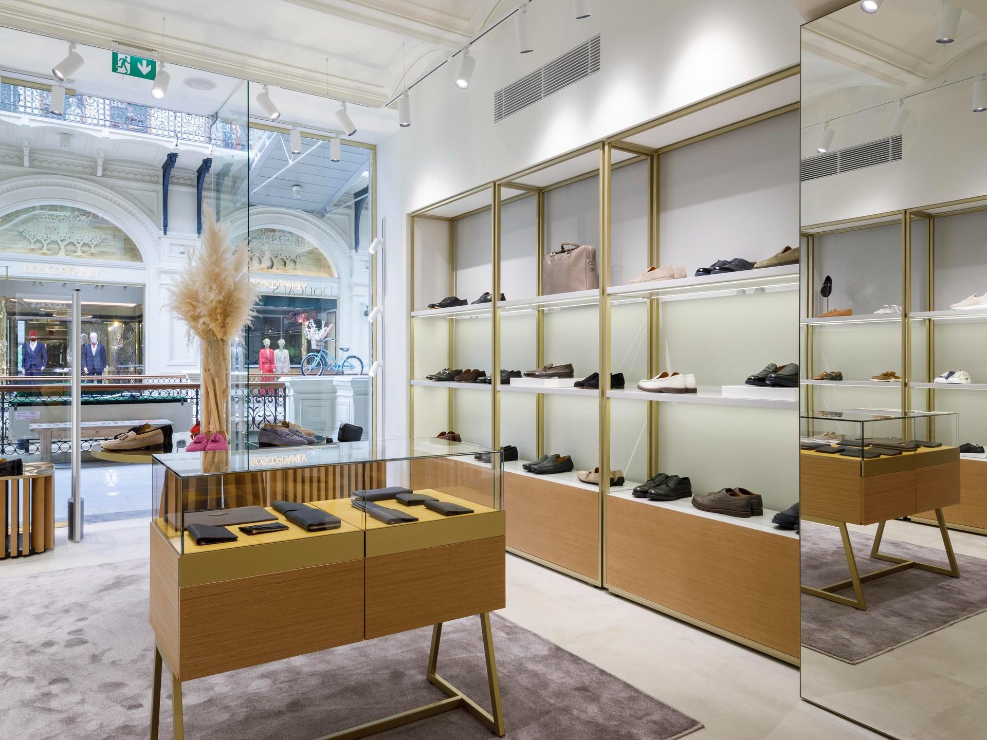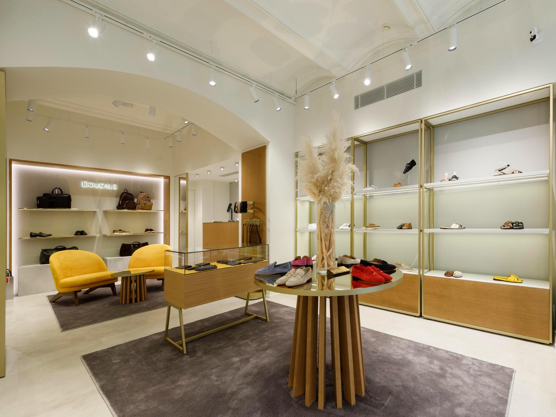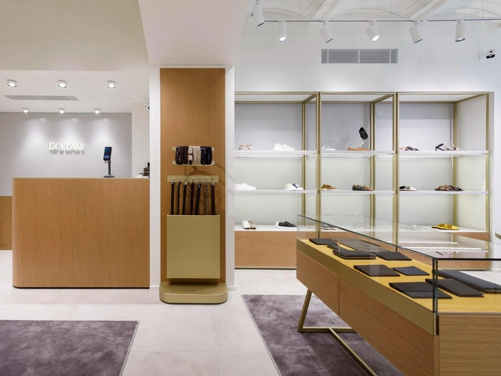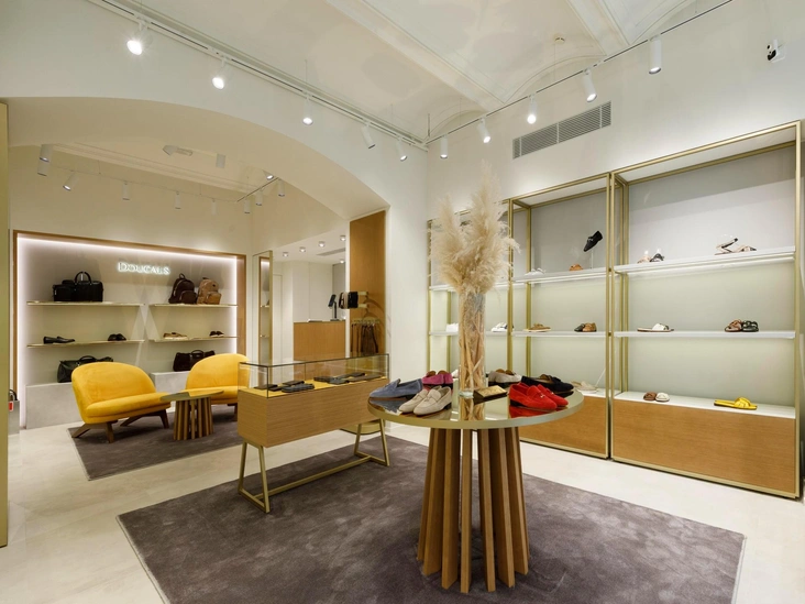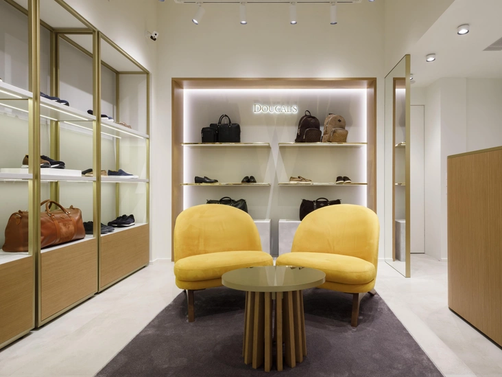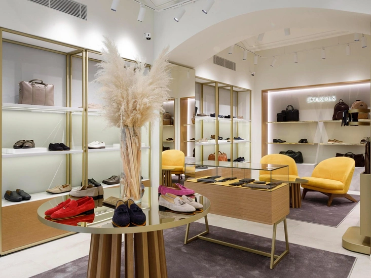 В ГУМе появился первый в стране монобрендовый бутик Doucal’s. Пространство стало логичным продолжением философии бренда. Полированное золото на демонстрационных столах символизирует роскошь, а матовые латунные стойки добавляют сдержанный, но изысканный акцент. Полки, отделанные натуральным тиком, напоминают о традициях ручного мастерства, лежащих в основе производства. Интерьер дополняют горчично-желтые пуфы с замшевым эффектом. А серое ковровое покрытие и бетонные подиумы подчеркивают баланс между наследием и актуальными трендами.