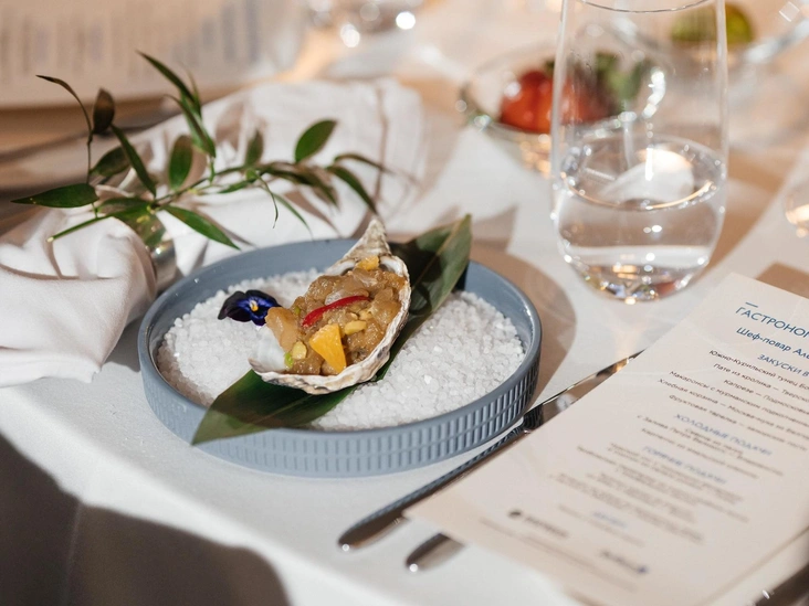 За меню отвечал шеф-повар отеля Алексей Семушкин: за 15-летний опыт работы в отелях и ресторанах столицы он научился мастерски отбирать уникальные ингредиенты и переосмысливать с их помощью классические блюда русской и европейской кухни. Гости познакомились с авторским сет-меню из семи перемен, вдохновленное кухней 11 регионов России. Отборные продукты из холодных и теплых уголков страны, разделенные тысячами километров, он объединил в органичную композицию вкусов и удачно дополнил винами из российских виноделен.