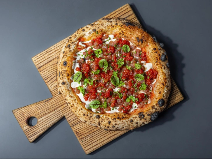 Бренд-шеф Егор Макаров из BRUNO TSUM, который обладает званием Лучшего молодого шефа России-2023, предлагает попробовать свою новую авторскую пиццу. Он разработал ее на базе классических блюд: тартара из тунца и вителло тоннато. В составе — тунец, кунжутный дрессинг, томатная сальса с мятой, лук сибулет, соус тоннато и микрозелень с томатным соусом.